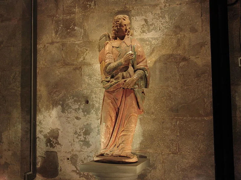 Secondo gli studi dell’illustre accademico sarebbe stata realizzata in età giovanile dal grande Leonardo intorno al 1470, nella Bottega del Verrocchio. A conferma della realizzazione vinciniana, l’angelo presenta numerosi caratteri distintivi del Maestro: dal drappeggio del braccio alla capigliatura, dal volto all’impostazione del corpo che suggerisce il movimento. Documenti d’archivio dicono che, danneggiata involontariamente con una scala da un sagrestano, nel 1773 avrebbe subito un piccolo restauro.